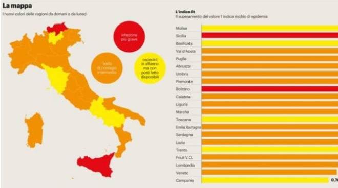 Sono dieci le regioni che nelle prossime due settimane potrebbero avere numeri tali da superare le soglie per entrare nella zona arancione due si avvicinano invece al giallo e la provincia autonoma di Bolzano potrebbe tornare nella zona bianca. Zona arancione anche in Sicilia. Emilia Romagna ancora in zona bianca grazie ai reparti.